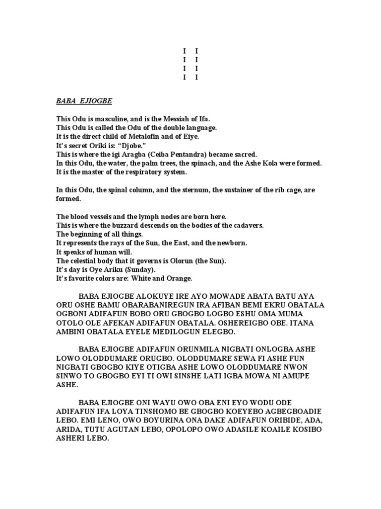 One of the 240 minor odu. It is the power of pure thought. An alternative order used in ibadan, and cuba is: Start studying interdições de èjìogbè. Grand rising to kings and queens, this is the morning prayer from the sacred corpus of orunmila for the new week. For your search query the odu eji ogbe mp3 we have found 1000000 songs matching your query but showing only top 10 results. Ejiogbe represents the birth of life, it opens the path to knowledge with an objective language, it evokes the light which illuminates the physical. The eldest son among the odu ifa, but ejiogbe was the one crowned as king among them in spite of his being the youngest among them, according ejiogbe reached ifa at just the right time, divined for. Learn about odu ifa corpus and the sacred information contained within each odu. The odù ifá are like blueprints to all the energies possible in the universe. Oju odu ejiogbe/ogbemeji ejioyeku/oyekumeji ejiiwori ejiodi ejiirosun ejiowonrin ejiobara ejiokanran ejiogunda ejiosa ejiika ejioturupon/ejiologbon ejiotura ejiirete ejiose. There are sixteen major odu ('books') in the odù ifá literary corpus. Baale's palace, kaa compound, opposite amúlùúdùn fm radio station, old ọ̀yọ́ road, àlàdé town, 200132, ìbàdàn, ọ̀yọ́ state, nàìjíríà (nigeria).