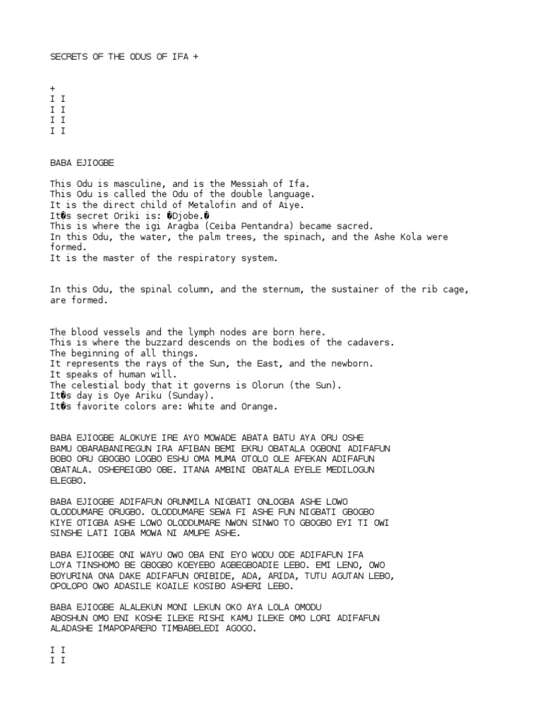 There are sixteen major odu ('books') in the odù ifá literary corpus. The odù ifá are like blueprints to all the energies possible in the universe. Peace #ifa #orunmila #prayer #oduifa. Inexplicablemente uno de los signos más detallados en el tratado enciclopédico de ifa (conocido como el libro de los odus), es ejiogbe, también llamado ogbe meyi. Please share this article with someone you know.